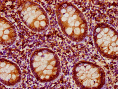 IHC image of CSB-PA875688LA01HU diluted at 1:200 and staining in paraffin-embedded human appendix tissue performed on a Leica BondTM system. After dewaxing and hydration, antigen retrieval was mediated by high pressure in a citrate buffer (pH 6.0). Section was blocked with 10% normal goat serum 30min at RT. Then primary antibody (1% BSA) was incubated at 4°C overnight. The primary is detected by a biotinylated secondary antibody and visualized using an HRP conjugated SP system.