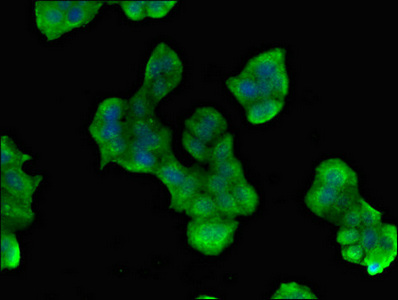 Immunofluorescent analysis of PC-3 cells using CSB-PA017791LA01HU at dilution of 1:100 and Alexa Fluor 488-congugated AffiniPure Goat Anti-Rabbit IgG(H+L)