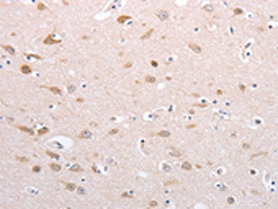 The image on the left is immunohistochemistry of paraffin-embedded Human brain tissue using CSB-PA526117(PFN4 Antibody) at dilution 1/20, on the right is treated with fusion protein. (Original magnification: ×200)