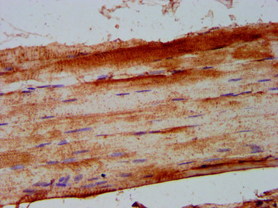 IHC image of CSB-PA017922LA01HU diluted at 1:500 and staining in paraffin-embedded human skeletal muscle tissue performed on a Leica BondTM system. After dewaxing and hydration, antigen retrieval was mediated by high pressure in a citrate buffer (pH 6.0). Section was blocked with 10% normal goat serum 30min at RT. Then primary antibody (1% BSA) was incubated at 4°C overnight. The primary is detected by a biotinylated secondary antibody and visualized using an HRP conjugated SP system.