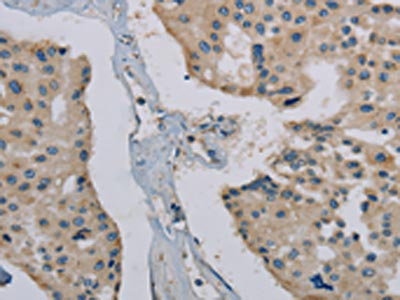 The image on the left is immunohistochemistry of paraffin-embedded Human prostate cancer tissue using CSB-PA942630(PHKG1 Antibody) at dilution 1/20, on the right is treated with synthetic peptide. (Original magnification: ×200)