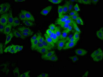 Immunofluorescence staining of HepG2 cells with CSB-PA845148LA01HU at 1: 133, counter-stained with DAPI. The cells were fixed in 4% formaldehyde, permeabilized tissue using 0.2% Triton X-100 and blocked in 10% normal Goat Serum. The cells were then incubated with the antibody overnight at 4°C.The secondary antibody was Alexa Fluor 488-congugated AffiniPure Goat Anti-Rabbit IgG(H+L) .