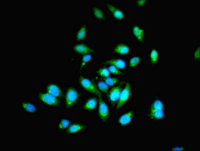 Immunofluorescent analysis of Hela cells using CSB-PA017942DA01HU at dilution of 1:100 and Alexa Fluor 488-congugated AffiniPure Goat Anti-Rabbit IgG(H+L)
