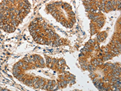 The image on the left is immunohistochemistry of paraffin-embedded Human colon cancer tissue using CSB-PA828391(PIBF1 Antibody) at dilution 1/20, on the right is treated with synthetic peptide. (Original magnification: ×200)