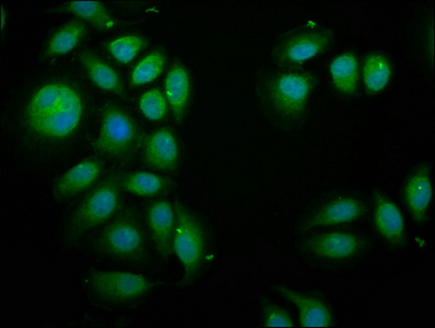 Immunofluorescence staining of A549 cells with CSB-PA747806LA01HU at 1:100, counter-stained with DAPI. The cells were fixed in 4% formaldehyde, permeabilized using 0.2% Triton X-100 and blocked in 10% normal Goat Serum. The cells were then incubated with the antibody overnight at 4°C. The secondary antibody was Alexa Fluor 488-congugated AffiniPure Goat Anti-Rabbit IgG(H+L).