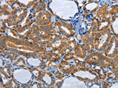 The image on the left is immunohistochemistry of paraffin-embedded Human thyroid cancer tissue using CSB-PA785311(PIK3R4 Antibody) at dilution 1/85, on the right is treated with synthetic peptide. (Original magnification: ×200)