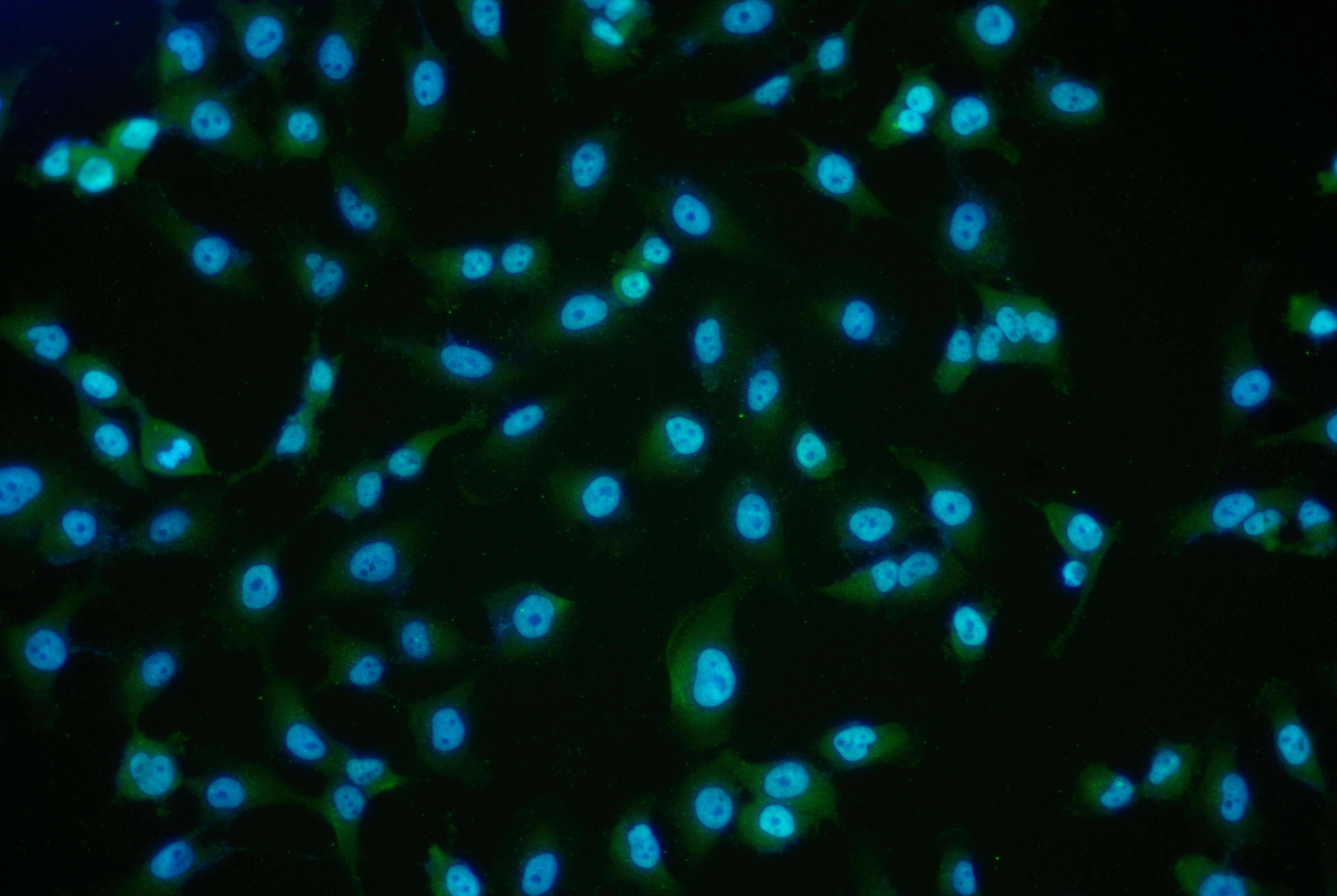 Immunofluorescence staining of A549 cell with 5% goat serum, counter-stained with DAPI. The cells were fixed in 4% formaldehyde and blocked in 10% normal Goat Serum. The cells were then incubated with the antibody overnight at 4C. The secondary antibody was Alexa Fluor 488-congugated AffiniPure Goat Anti-Rabbit IgG(H+L).