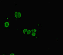 Immunofluorescent analysis of HepG2 cells using CSB-PA873705LA01HU at dilution of 1:100 and Alexa Fluor 488-congugated AffiniPure Goat Anti-Rabbit IgG(H+L)