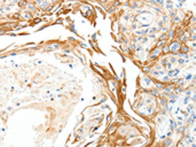 The image on the left is immunohistochemistry of paraffin-embedded Human esophagus cancer tissue using CSB-PA111403(PLAT Antibody) at dilution 1/50, on the right is treated with synthetic peptide. (Original magnification: ×200)