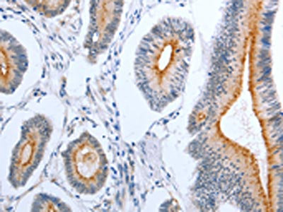 The image on the left is immunohistochemistry of paraffin-embedded Human colon cancer tissue using CSB-PA628429(PLAUR Antibody) at dilution 1/50, on the right is treated with fusion protein. (Original magnification: ×200)