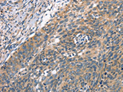 The image on the left is immunohistochemistry of paraffin-embedded Human cervical cancer tissue using CSB-PA986935(PLEKHO1 Antibody) at dilution 1/70, on the right is treated with fusion protein. (Original magnification: ×200)