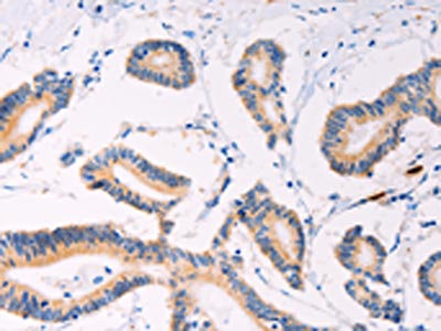 The image on the left is immunohistochemistry of paraffin-embedded Human colon cancer tissue using CSB-PA065885(PLIN2 Antibody) at dilution 1/20, on the right is treated with synthetic peptide. (Original magnification: ×200)
