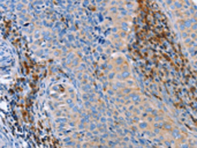 The image on the left is immunohistochemistry of paraffin-embedded Human cervical cancer tissue using CSB-PA273685(PLK3 Antibody) at dilution 1/40, on the right is treated with fusion protein. (Original magnification: ×200)