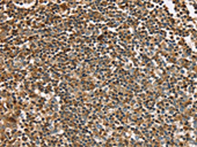 The image on the left is immunohistochemistry of paraffin-embedded Human tonsil tissue using CSB-PA077979(PLS3 Antibody) at dilution 1/30, on the right is treated with fusion protein. (Original magnification: ×200)