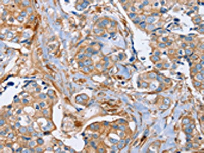 The image on the left is immunohistochemistry of paraffin-embedded Human breast cancer tissue using CSB-PA241730(PLS3 Antibody) at dilution 1/20, on the right is treated with fusion protein. (Original magnification: ×200)