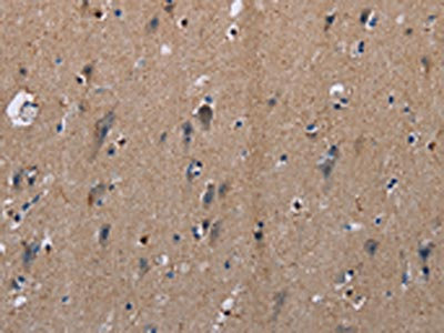 The image on the left is immunohistochemistry of paraffin-embedded Human brain tissue using CSB-PA221959(PLXNA2 Antibody) at dilution 1/40, on the right is treated with synthetic peptide. (Original magnification: ×200)