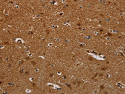 The image on the left is immunohistochemistry of paraffin-embedded Human brain tissue using CSB-PA090243(PNOC Antibody) at dilution 1/40, on the right is treated with synthetic peptide. (Original magnification: ×200)