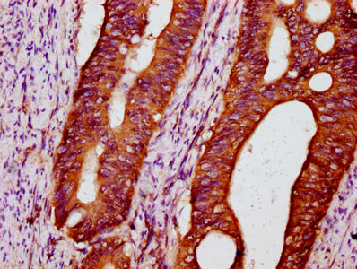 IHC image of CSB-PA843309LA01HU diluted at 1:300 and staining in paraffin-embedded human colon cancer performed on a Leica BondTM system. After dewaxing and hydration, antigen retrieval was mediated by high pressure in a citrate buffer (pH 6.0). Section was blocked with 10% normal goat serum 30min at RT. Then primary antibody (1% BSA) was incubated at 4°C overnight. The primary is detected by a biotinylated secondary antibody and visualized using an HRP conjugated SP system.