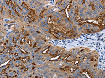 The image on the left is immunohistochemistry of paraffin-embedded Human ovarian cancer tissue using CSB-PA568085(PODXL Antibody) at dilution 1/25, on the right is treated with synthetic peptide. (Original magnification: ×200)