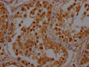 IHC image of CSB-PA02519A0Rb diluted at 1:400 and staining in paraffin-embedded human testis tissue performed on a Leica BondTM system. After dewaxing and hydration, antigen retrieval was mediated by high pressure in a citrate buffer (pH 6.0). Section was blocked with 10% normal goat serum 30min at RT. Then primary antibody (1% BSA) was incubated at 4°C overnight. The primary is detected by a Goat anti-rabbit polymer IgG labeled by HRP and visualized using 0.05% DAB.