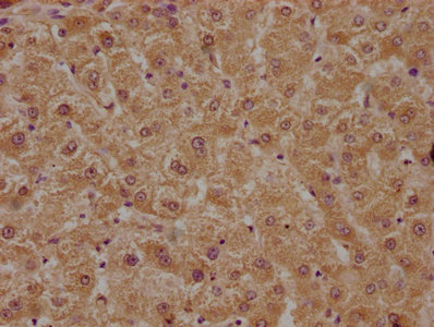 IHC image of CSB-PA018369LA01HU diluted at 1:400 and staining in paraffin-embedded human liver tissue performed on a Leica BondTM system. After dewaxing and hydration, antigen retrieval was mediated by high pressure in a citrate buffer (pH 6.0). Section was blocked with 10% normal goat serum 30min at RT. Then primary antibody (1% BSA) was incubated at 4°C overnight. The primary is detected by a biotinylated secondary antibody and visualized using an HRP conjugated SP system.