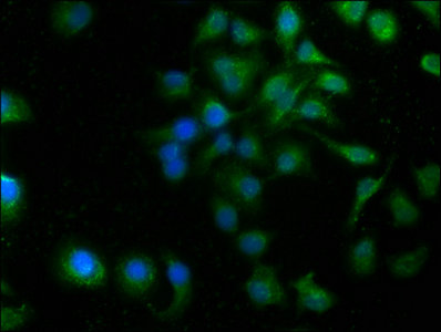 Immunofluorescence staining of A549 cells with CSB-PA887958LA01HU at 1:100, counter-stained with DAPI. The cells were fixed in 4% formaldehyde, permeabilized using 0.2% Triton X-100 and blocked in 10% normal Goat Serum. The cells were then incubated with the antibody overnight at 4°C. The secondary antibody was Alexa Fluor 488-congugated AffiniPure Goat Anti-Rabbit IgG(H+L).