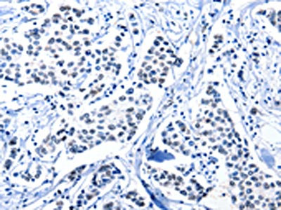 The image on the left is immunohistochemistry of paraffin-embedded Human breast cancer tissue using CSB-PA856023(POU2AF1 Antibody) at dilution 1/15, on the right is treated with synthetic peptide. (Original magnification: ×200)