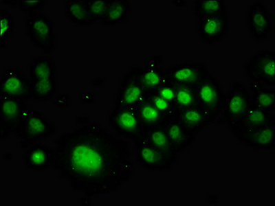 Immunofluorescence staining of Hela cells with CSB-PA018393LA01HU at 1:166, counter-stained with DAPI. The cells were fixed in 4% formaldehyde, permeabilized using 0.2% Triton X-100 and blocked in 10% normal Goat Serum. The cells were then incubated with the antibody overnight at 4°C. The secondary antibody was Alexa Fluor 488-congugated AffiniPure Goat Anti-Rabbit IgG(H+L).
