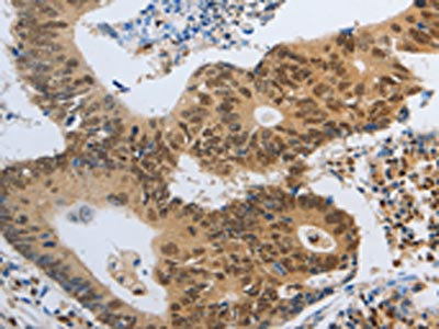 The image on the left is immunohistochemistry of paraffin-embedded Human colon cancer tissue using CSB-PA280193(POU2F2 Antibody) at dilution 1/40, on the right is treated with fusion protein. (Original magnification: ×200)