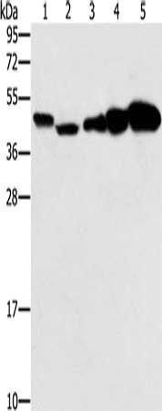 Gel: 10%SDS-PAGE, Lysate: 40 μg, Lane 1-5: Hela cells, Raji cells, Jurkat cells, A549 cells, NIH/3T3 cells, Primary antibody: CSB-PA298674(PPAT Antibody) at dilution 1/250, Secondary antibody: Goat anti rabbit IgG at 1/8000 dilution, Exposure time: 20 seconds