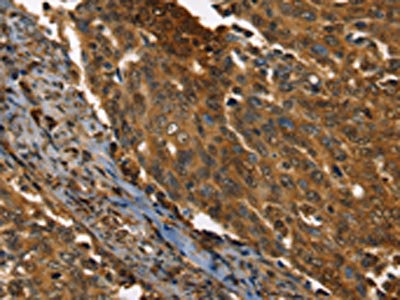The image on the left is immunohistochemistry of paraffin-embedded Human cervical cancer tissue using CSB-PA014187(PPIA Antibody) at dilution 1/35, on the right is treated with fusion protein. (Original magnification: ×200)