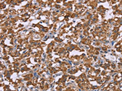 The image on the left is immunohistochemistry of paraffin-embedded Human thyroid cancer tissue using CSB-PA781876(PPIF Antibody) at dilution 1/45, on the right is treated with fusion protein. (Original magnification: ×200)