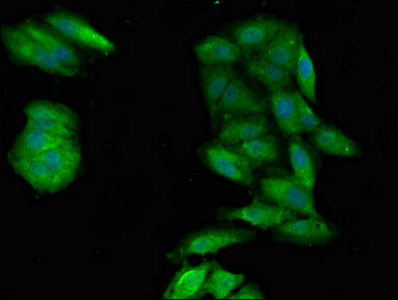 Immunofluorescent analysis of Hela cells using CSB-PA018503LA01HU at dilution of 1:100 and Alexa Fluor 488-congugated AffiniPure Goat Anti-Rabbit IgG(H+L)