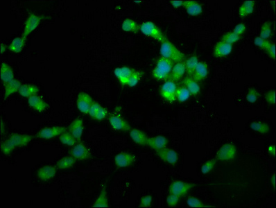 Immunofluorescence staining of SH-SY5Y cells with CSB-PA018565LA01HU at 1:200, counter-stained with DAPI. The cells were fixed in 4% formaldehyde, permeabilized using 0.2% Triton X-100 and blocked in 10% normal Goat Serum. The cells were then incubated with the antibody overnight at 4°C. The secondary antibody was Alexa Fluor 488-congugated AffiniPure Goat Anti-Rabbit IgG(H+L).