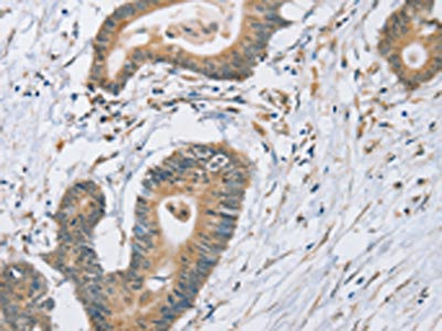 The image on the left is immunohistochemistry of paraffin-embedded Human colon cancer tissue using CSB-PA580962(PRAF2 Antibody) at dilution 1/35, on the right is treated with synthetic peptide. (Original magnification: ×200)