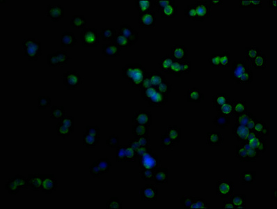 Immunofluorescence staining of K562 cells with CSB-PA018605LA01HU at 1:50, counter-stained with DAPI. The cells were fixed in 4% formaldehyde, permeabilized using 0.2% Triton X-100 and blocked in 10% normal Goat Serum. The cells were then incubated with the antibody overnight at 4°C. The secondary antibody was Alexa Fluor 488-congugated AffiniPure Goat Anti-Rabbit IgG(H+L).
