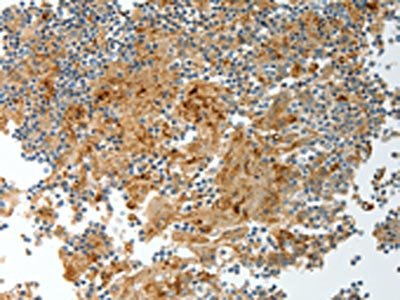 The image on the left is immunohistochemistry of paraffin-embedded Human tonsil tissue using CSB-PA241683(PRCP Antibody) at dilution 1/20, on the right is treated with fusion protein. (Original magnification: ×200)