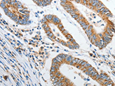 The image on the left is immunohistochemistry of paraffin-embedded Human colon cancer tissue using CSB-PA912013(PRDX1 Antibody) at dilution 1/20, on the right is treated with synthetic peptide. (Original magnification: ×200)
