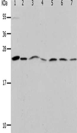 Gel: 12%SDS-PAGE, Lysate: 40 μg, Lane 1-7: Mouse liver tissue, NIH/3T3 cells, RAW264.7 cells, 293T cells, K562 cells, Jurkat cells, hela cells, Primary antibody: CSB-PA912013(PRDX1 Antibody) at dilution 1/400, Secondary antibody: Goat anti rabbit IgG at 1/8000 dilution, Exposure time: 50 seconds