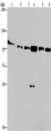 Gel: 6%SDS-PAGE, Lysate: 40 μg, Lane 1-6: Human testis tissue, K562 cells, A549 cells, Raji cells, NIH/3T3 cells, Hela cells, Primary antibody: CSB-PA145264(PRKD3 Antibody) at dilution 1/200, Secondary antibody: Goat anti rabbit IgG at 1/8000 dilution, Exposure time: 10 minutes