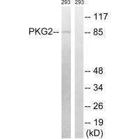 免疫原:Synthesized non-phosphopeptide derived from Human PKG2 around the phosphorylation site of serine 126 (G-V-S(p)-A-E).