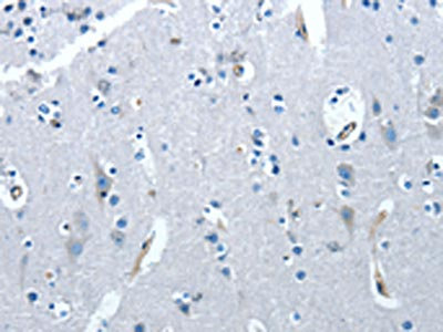 The image on the left is immunohistochemistry of paraffin-embedded Human brain tissue using CSB-PA051875(PRKX Antibody) at dilution 1/20, on the right is treated with synthetic peptide. (Original magnification: ×200)