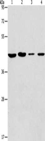 Gel: 10%SDS-PAGE, Lysate: 40 μg, Lane 1-4: A549 cells, Jurkat cells, 293T cells, K562 cells, Primary antibody: CSB-PA051875(PRKX Antibody) at dilution 1/200, Secondary antibody: Goat anti rabbit IgG at 1/8000 dilution, Exposure time: 20 seconds