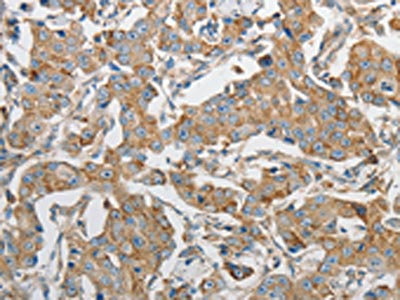 The image on the left is immunohistochemistry of paraffin-embedded Human breast cancer tissue using CSB-PA077190(PRMT5 Antibody) at dilution 1/20, on the right is treated with synthetic peptide. (Original magnification: ×200)