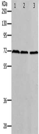 Gel: 10%SDS-PAGE, Lysate: 40 μg, Lane 1-3: K562 cells, hela cells, 293T cells, Primary antibody: CSB-PA077190(PRMT5 Antibody) at dilution 1/400, Secondary antibody: Goat anti rabbit IgG at 1/8000 dilution, Exposure time: 2 minutes