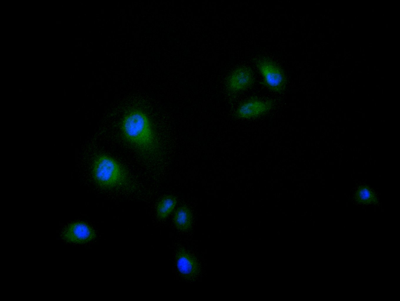 Immunofluorescence staining of Hela cell with CSB-PA852905LA01HU at 1:200, counter-stained with DAPI. The cells were fixed in 4% formaldehyde and blocked in 10% normal Goat Serum. The cells were then incubated with the antibody overnight at 4C. The secondary antibody was Alexa Fluor 488-congugated AffiniPure Goat Anti-Rabbit IgG(H+L).