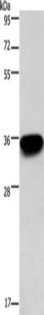 Gel: 8%SDS-PAGE, Lysate: 40 μg, Lane: 293T cells, Primary antibody: CSB-PA568434(PRPS1/2/1L1 Antibody) at dilution 1/400, Secondary antibody: Goat anti rabbit IgG at 1/8000 dilution, Exposure time: 1 minute