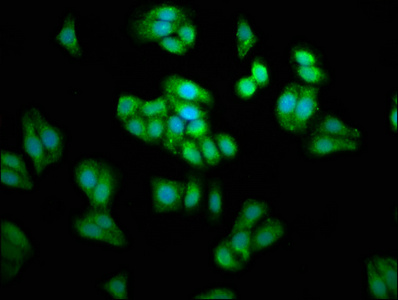 Immunofluorescence staining of HepG2 cells with CSB-PA018838LA01HU at 1:66, counter-stained with DAPI. The cells were fixed in 4% formaldehyde, permeabilized using 0.2% Triton X-100 and blocked in 10% normal Goat Serum. The cells were then incubated with the antibody overnight at 4°C. The secondary antibody was Alexa Fluor 488-congugated AffiniPure Goat Anti-Rabbit IgG(H+L).
