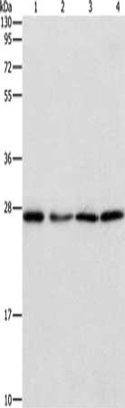 Gel: 10%SDS-PAGE, Lysate: 40 μg, Lane 1-4: 293T cells, hepG2 cells, human testis tissue, Human lung cancer tissue, Primary antibody: CSB-PA558008(PSMB7 Antibody) at dilution 1/310, Secondary antibody: Goat anti rabbit IgG at 1/8000 dilution, Exposure time: 5 seconds