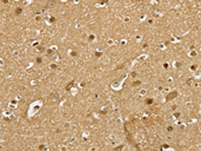 The image on the left is immunohistochemistry of paraffin-embedded Human brain tissue using CSB-PA123862(PSMC1 Antibody) at dilution 1/25, on the right is treated with fusion protein. (Original magnification: ×200)